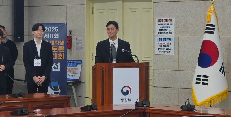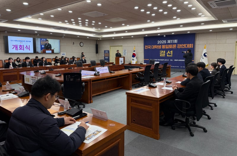 안녕하세요, 통일부 유니콘 기자단 공세현, 이현림입니다. 지난 11월 29일, 통일부 남북회담본부에서 ‘2025 제11회 전국 대학생 통일토론 경연대회’ 결선이 개최되었습니다. 이번 대회는 통일에 대한 청년 세대의 참여와 관심을 고조시키고, 평화통일의 공감대를 형성하며 대학생들의 창의적인 사고를 바탕으로 통일 정책에 관한 토론 문화를 선도하고자 개최되었습니다. 한반도의 미래를 이끌어갈 대학생들의 치열했던 평화통일 정책 논의, 함께 만나보실까요?